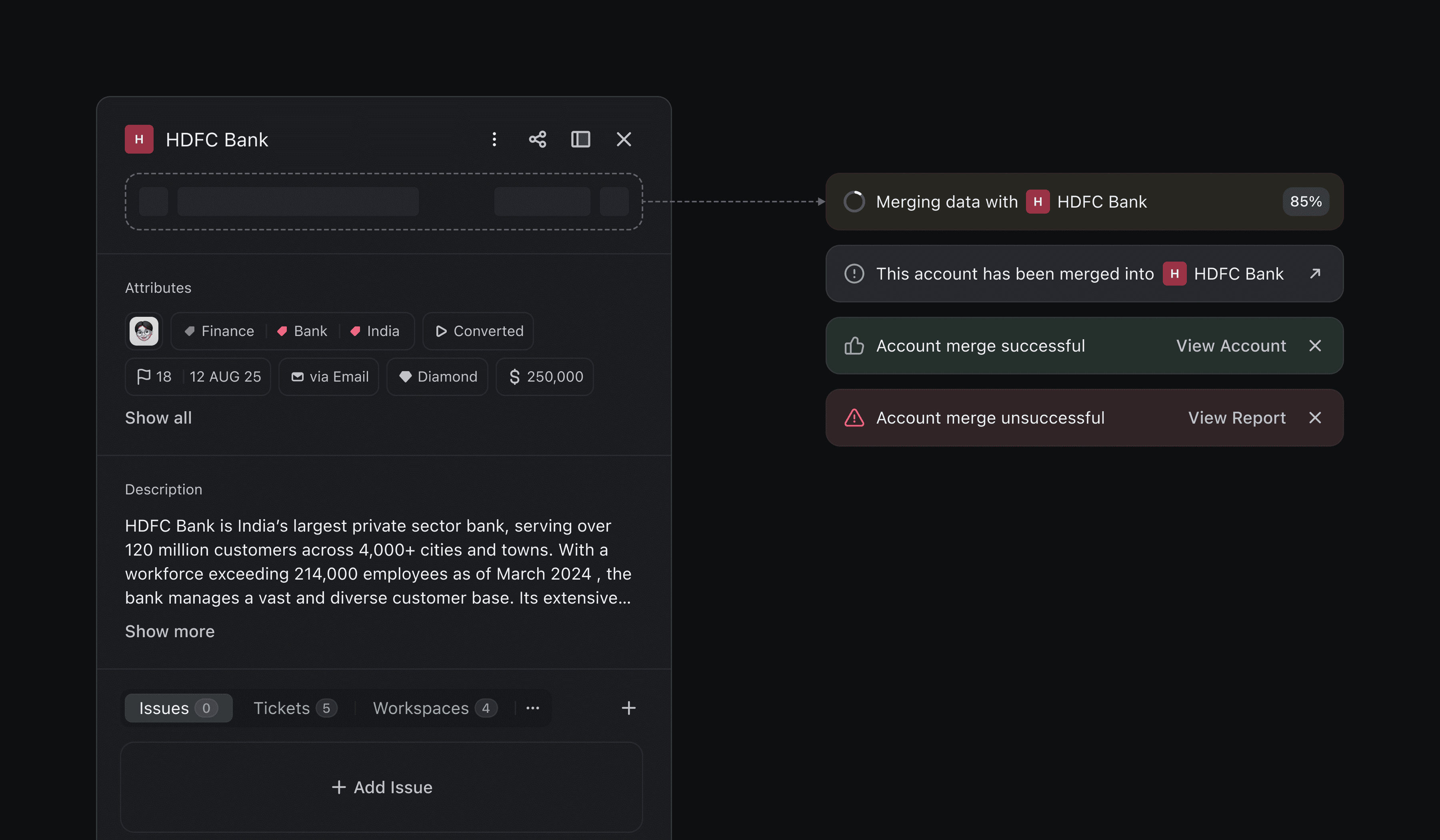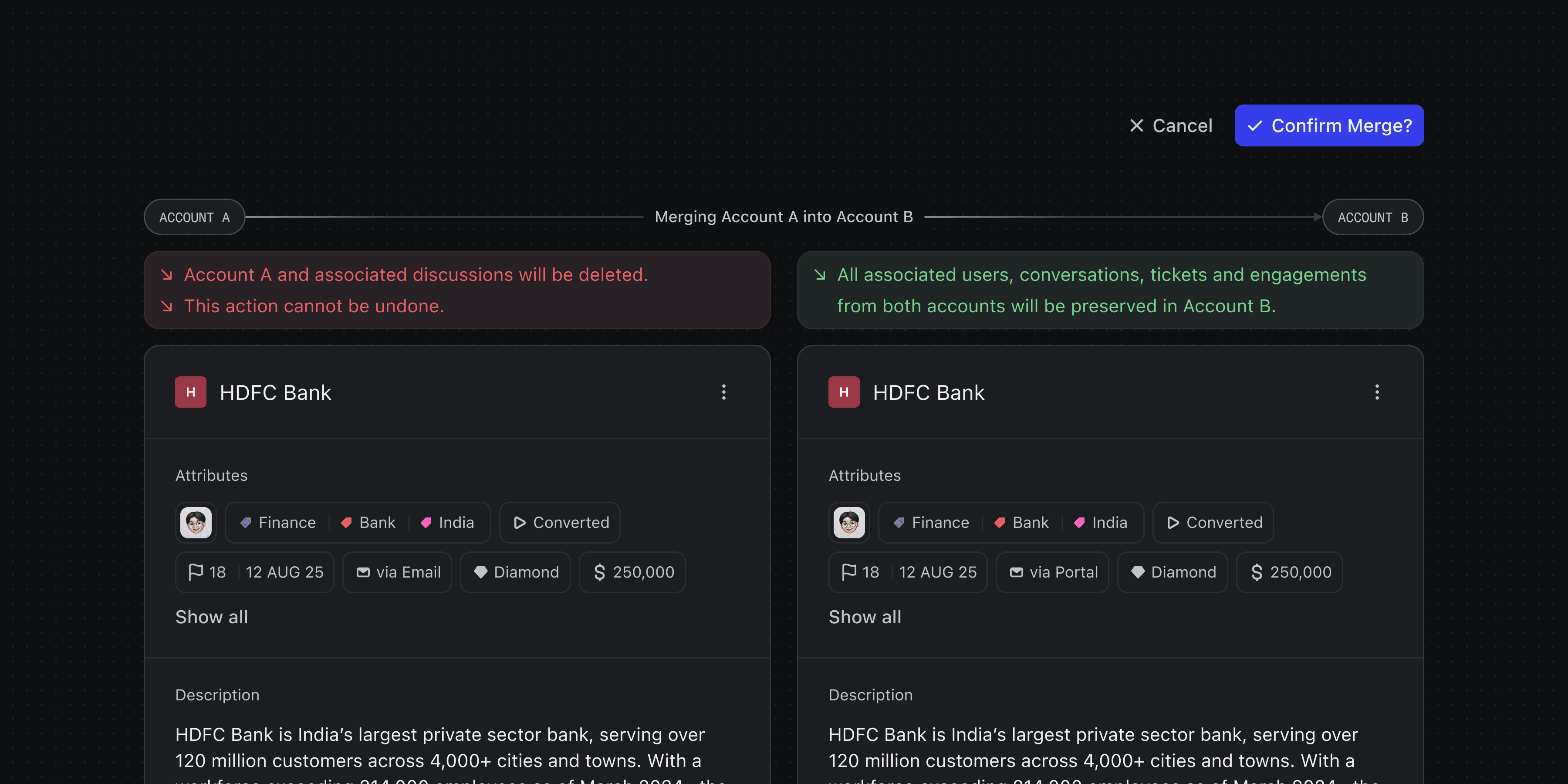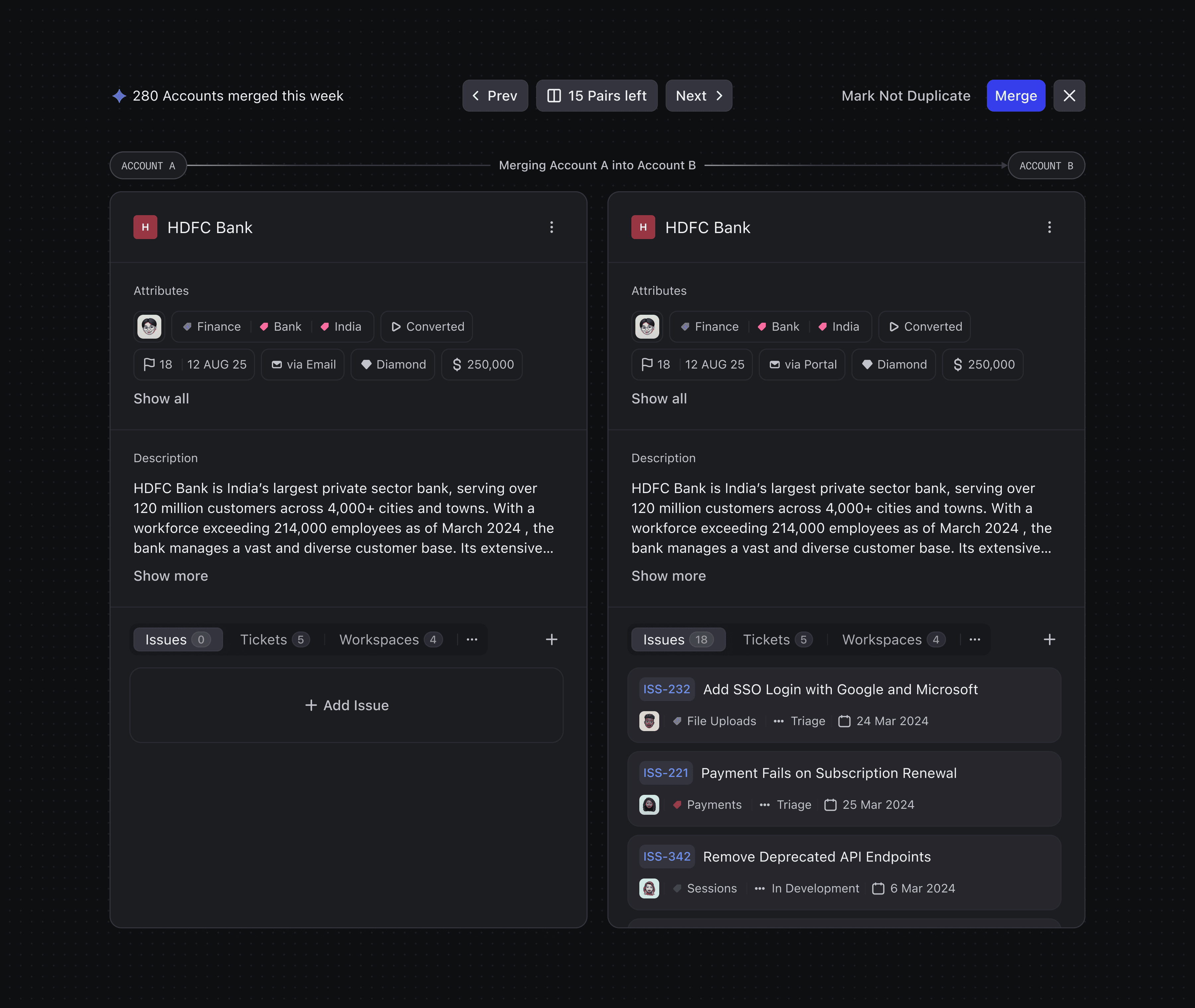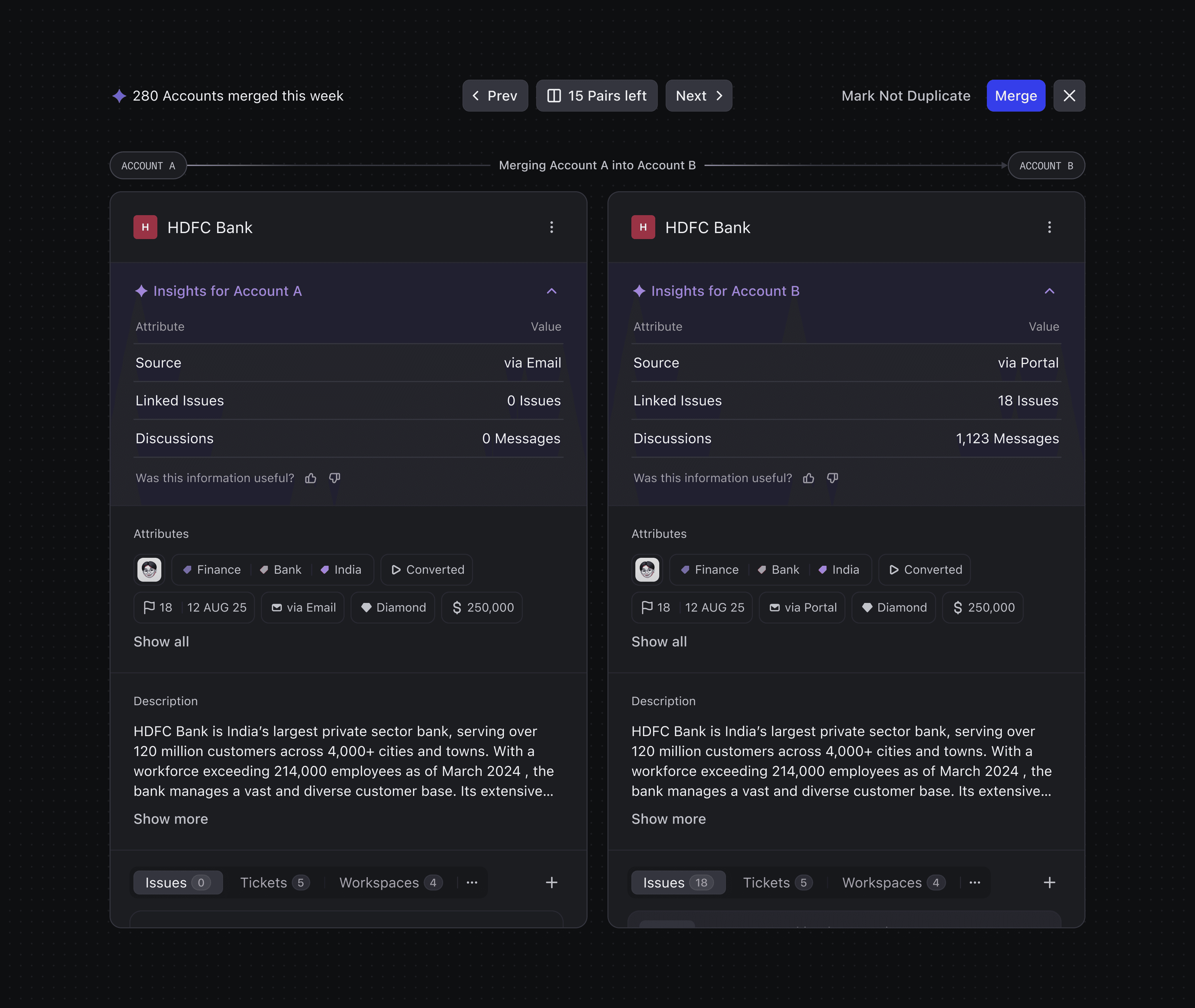 Since every field in a DevRev record is indexed, the dev team confirmed this was not only feasible but also fast. By removing the need to scroll and scan, AI makes the merge process smarter and quicker.