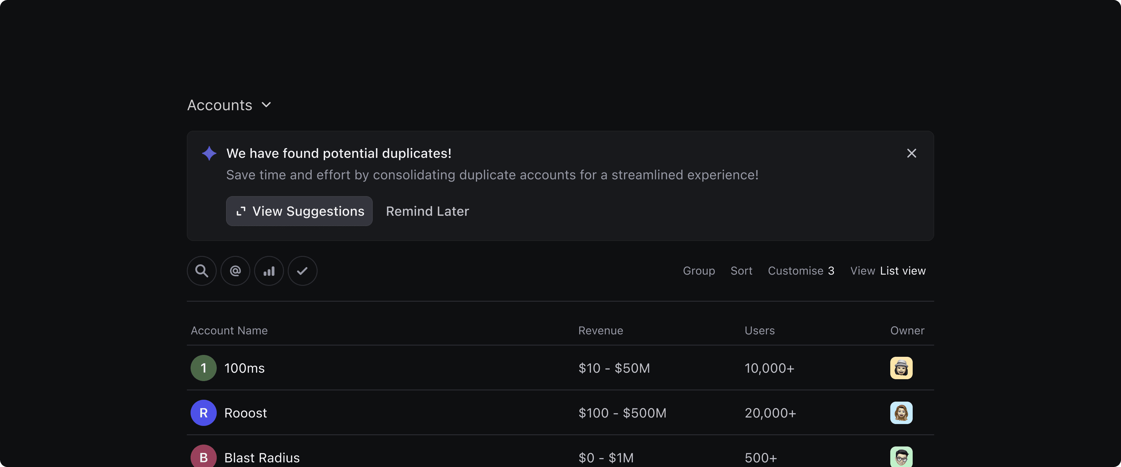 Suggestion Toasts: While navigating Grow Vista, a quiet toast highlights potential duplicates working silently in the background.