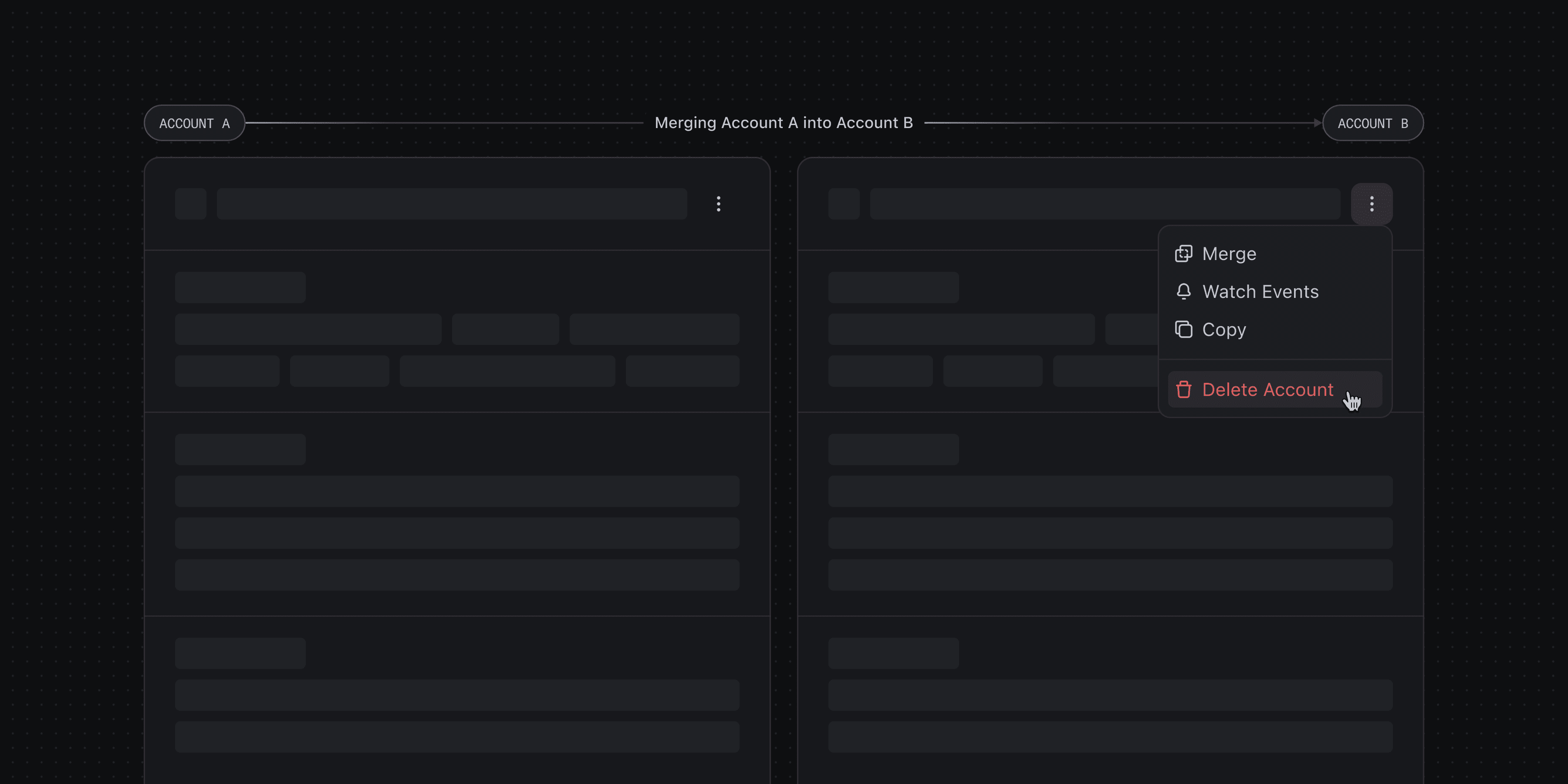 To make the deduplication flow transparent, I designed real-time cues directly within individual account records. During an ongoing merge, both records display an activity banner e.g. “Merging data with Account…" so it’s clear something’s in motion.