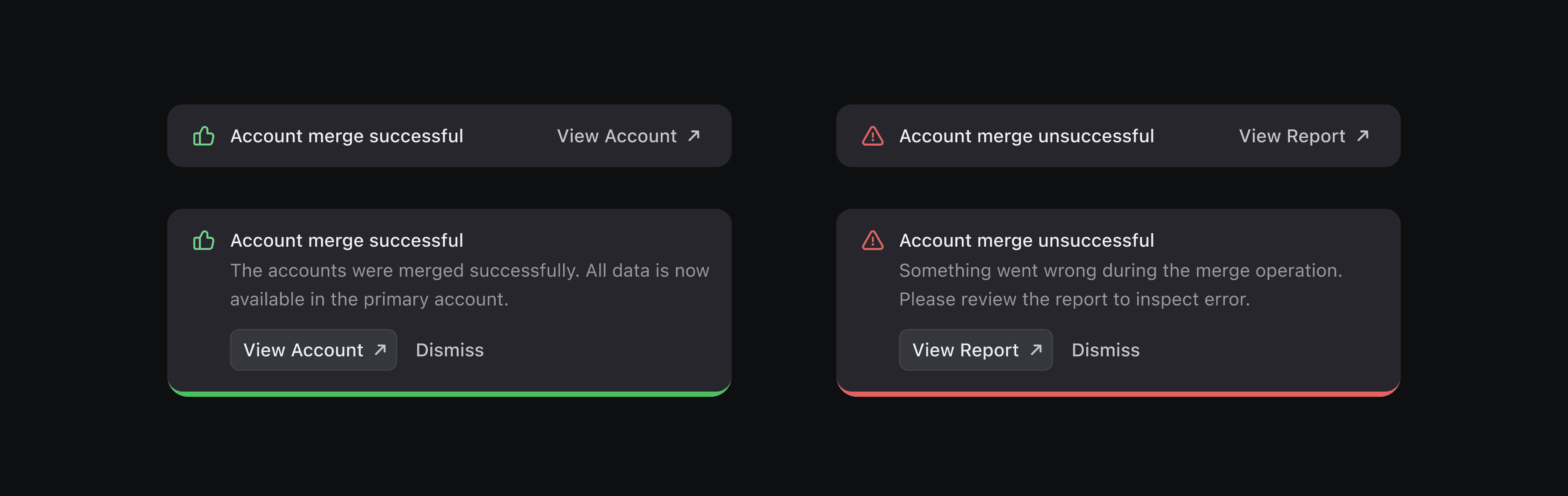 Since merges are irreversible, no undo option is shown: setting clear expectations. If something goes wrong, similar “Unsuccessful merge” toast appears with a View Report button, allowing users to inspect the error in detail.