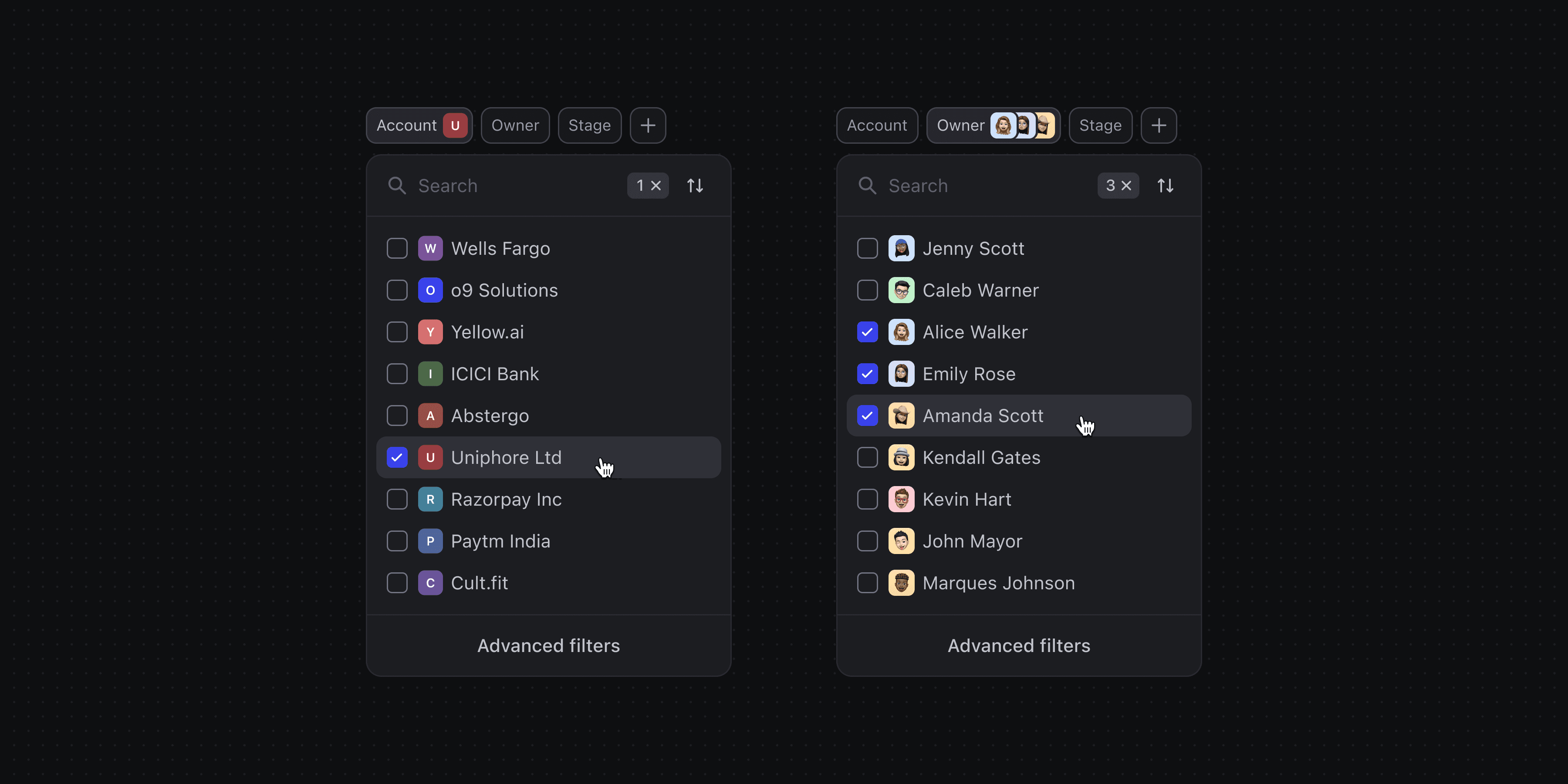 Filters allow narrowing down results by account, owner, or even just those assigned to you. Making it easy to focus on the task at hand.