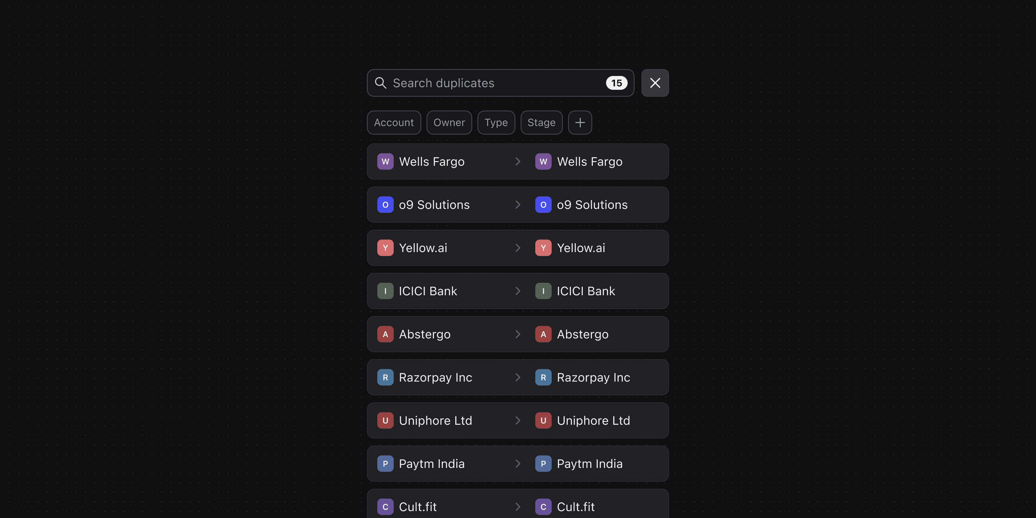 To make the deduplication flow more efficient, I integrated search directly into the duplicate pairs list. Users can search for any account to check if it has duplicate suggestions pending review.