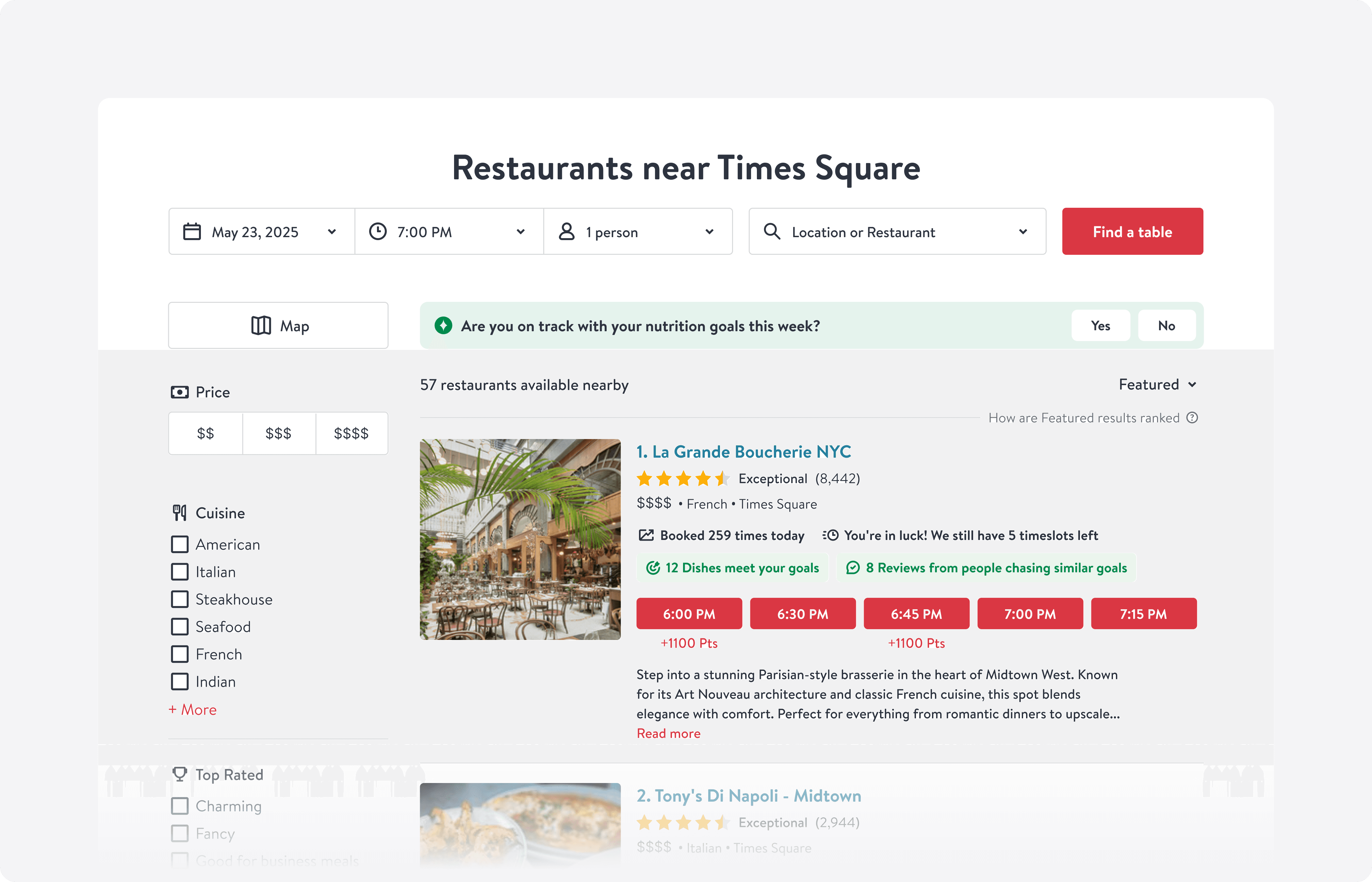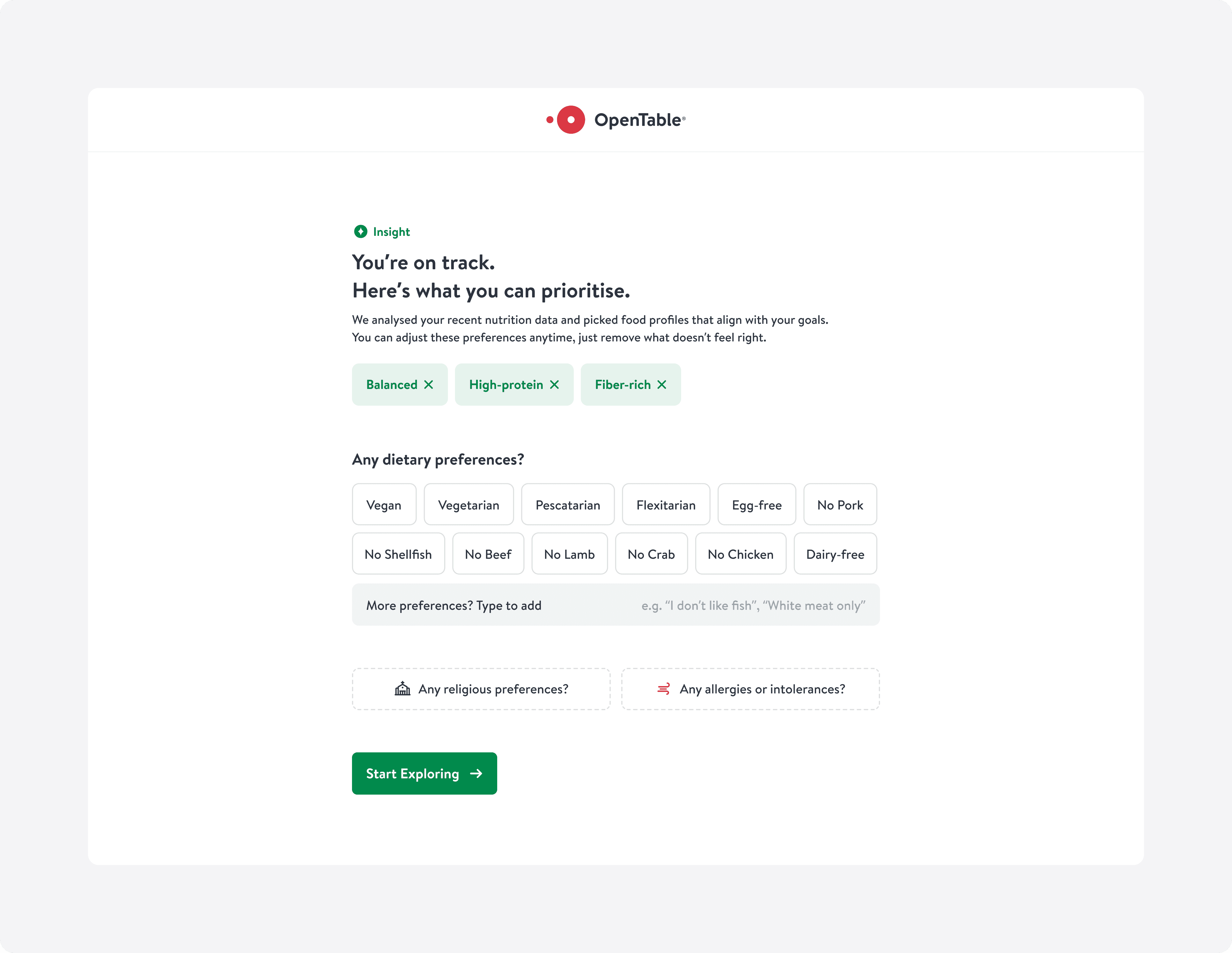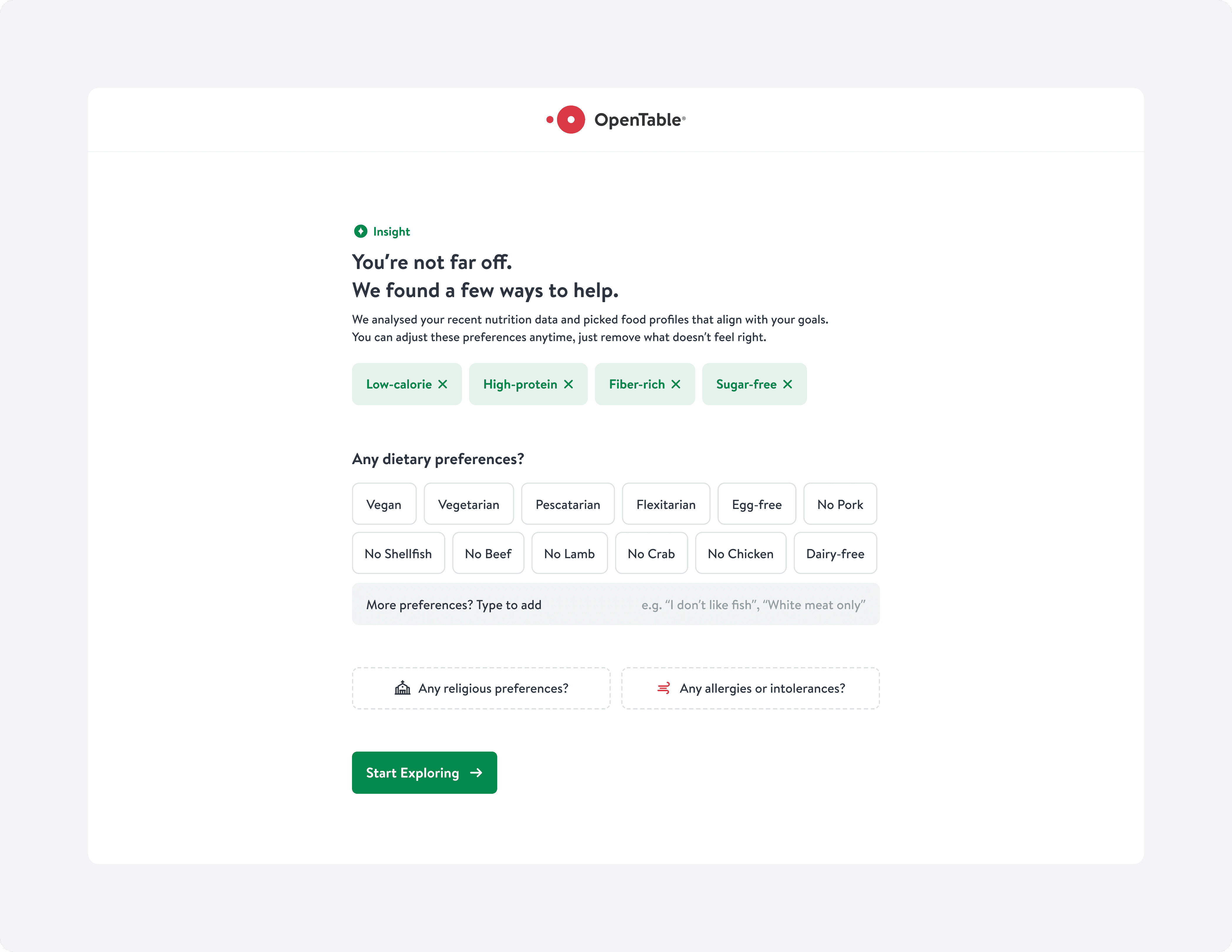 OpenTable already surfaces helpful context, such as how many times a restaurant has been booked today or how many slots remain. Building on this, I designed a way to surface nutrition-aligned insights directly within this familiar flow.