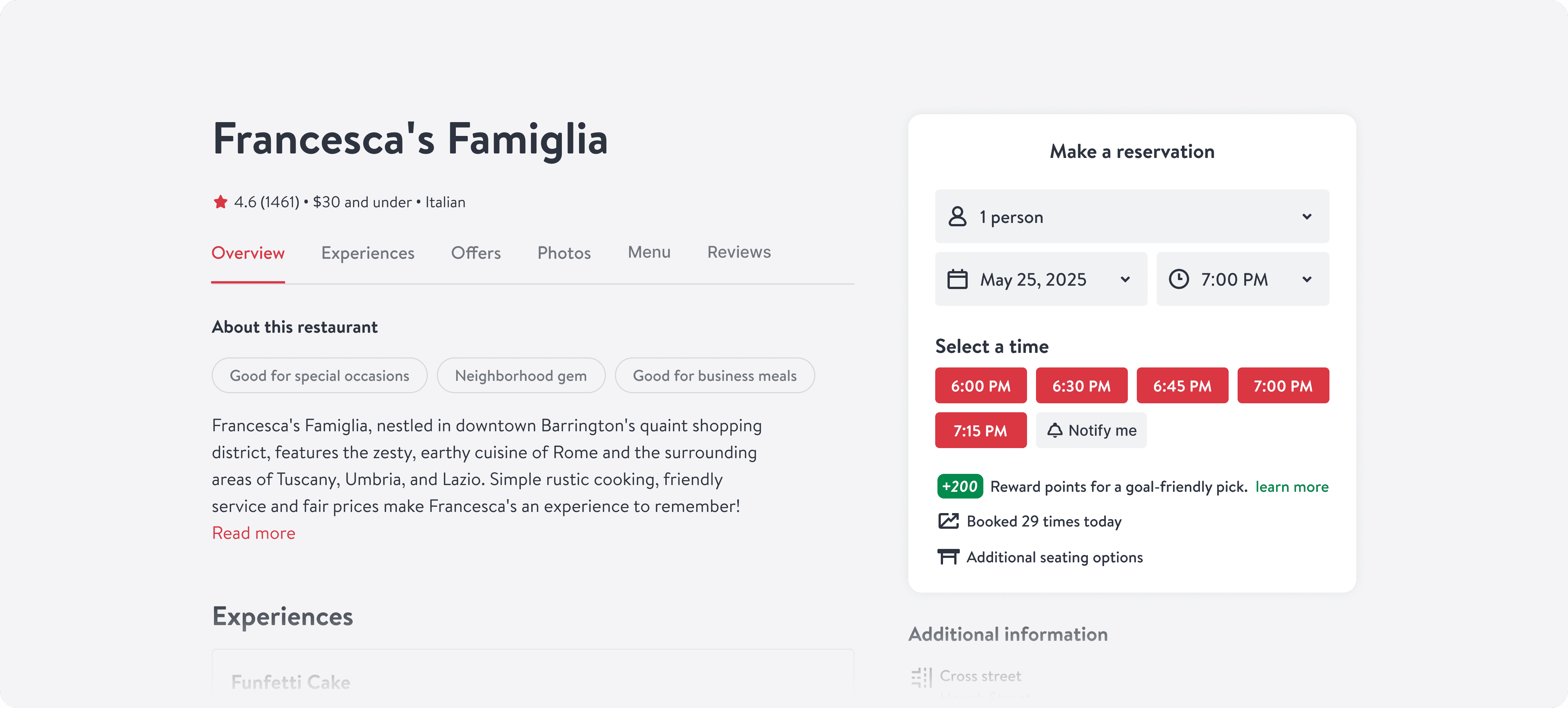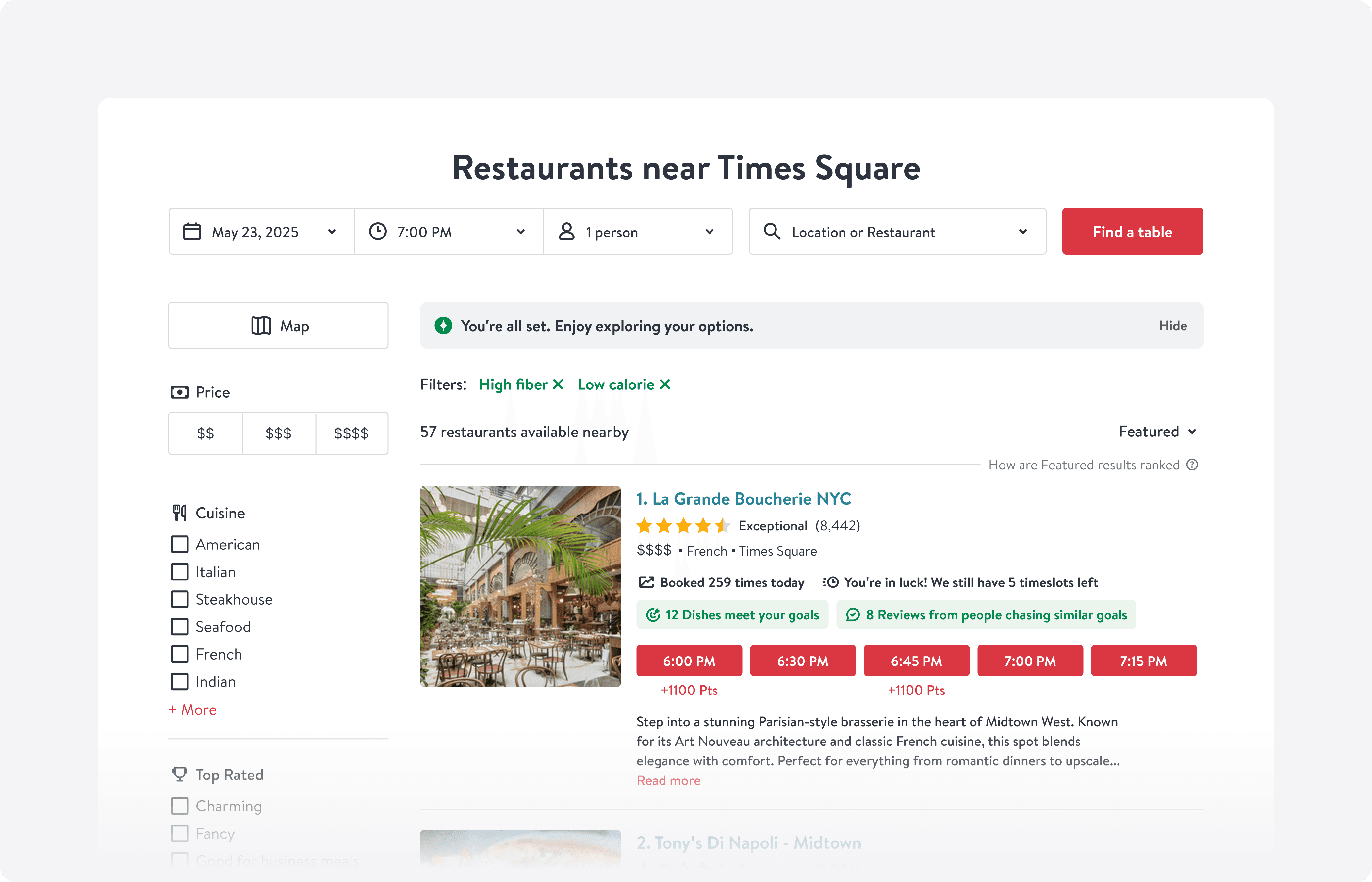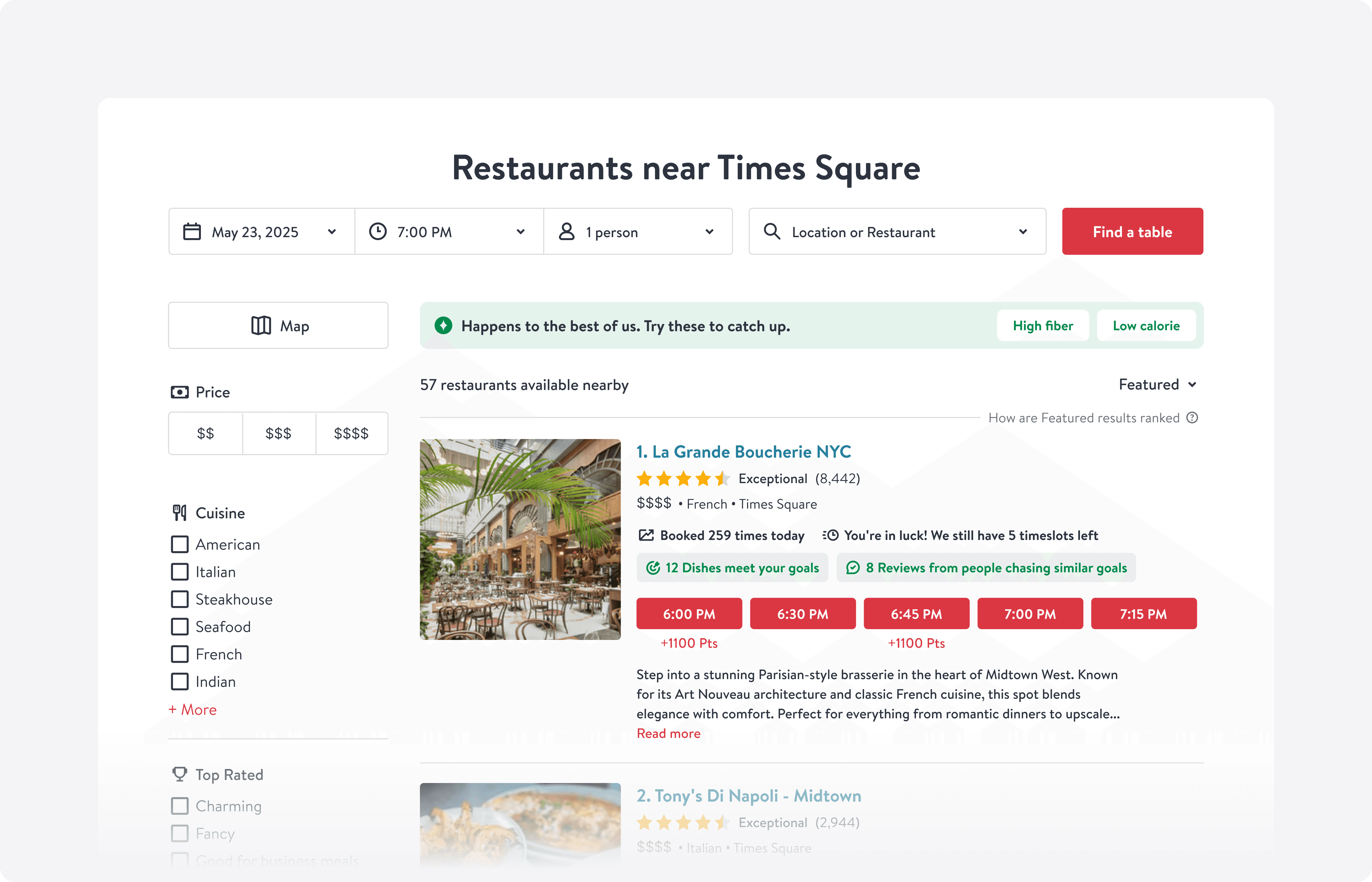 OpenTable already surfaces helpful context, such as how many times a restaurant has been booked today or how many slots remain. Building on this, I designed a way to surface nutrition-aligned insights directly within this familiar flow.