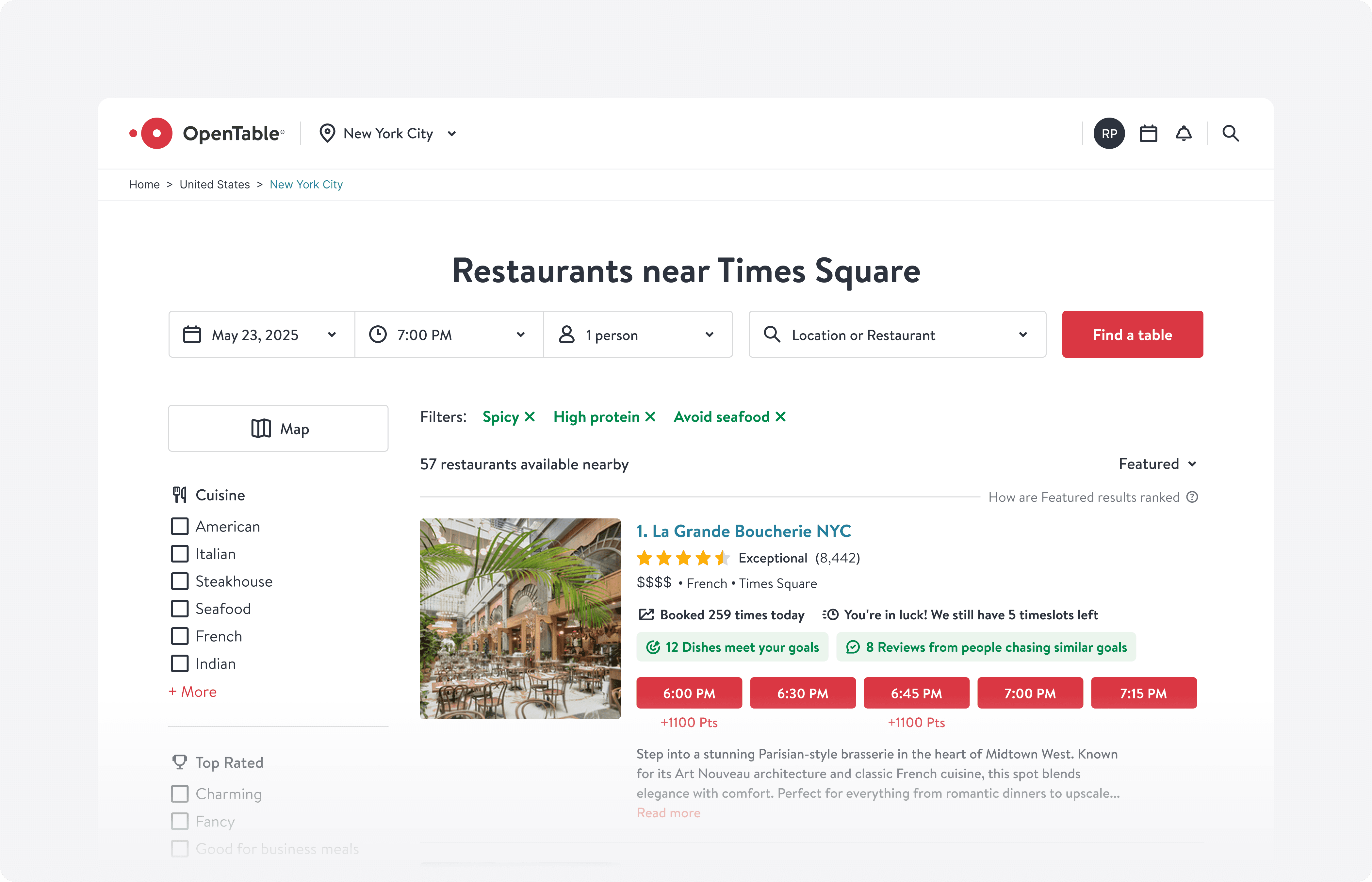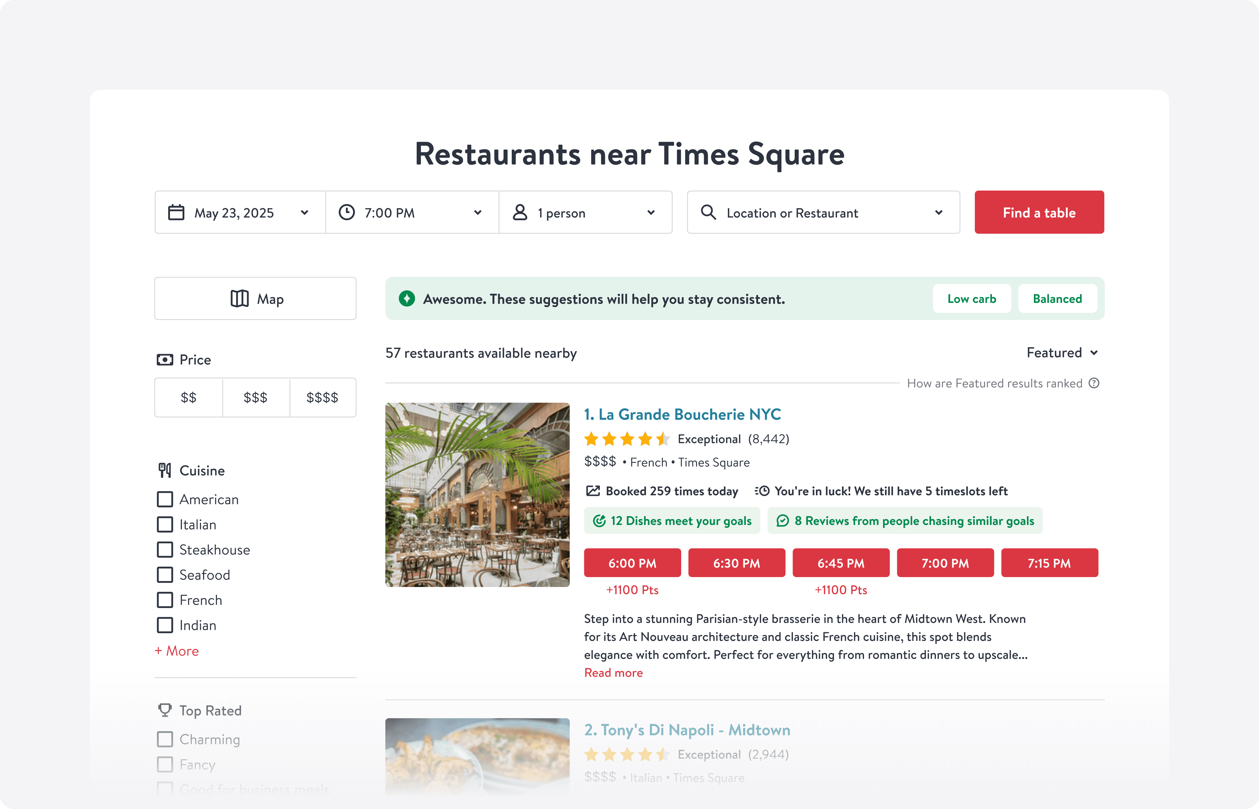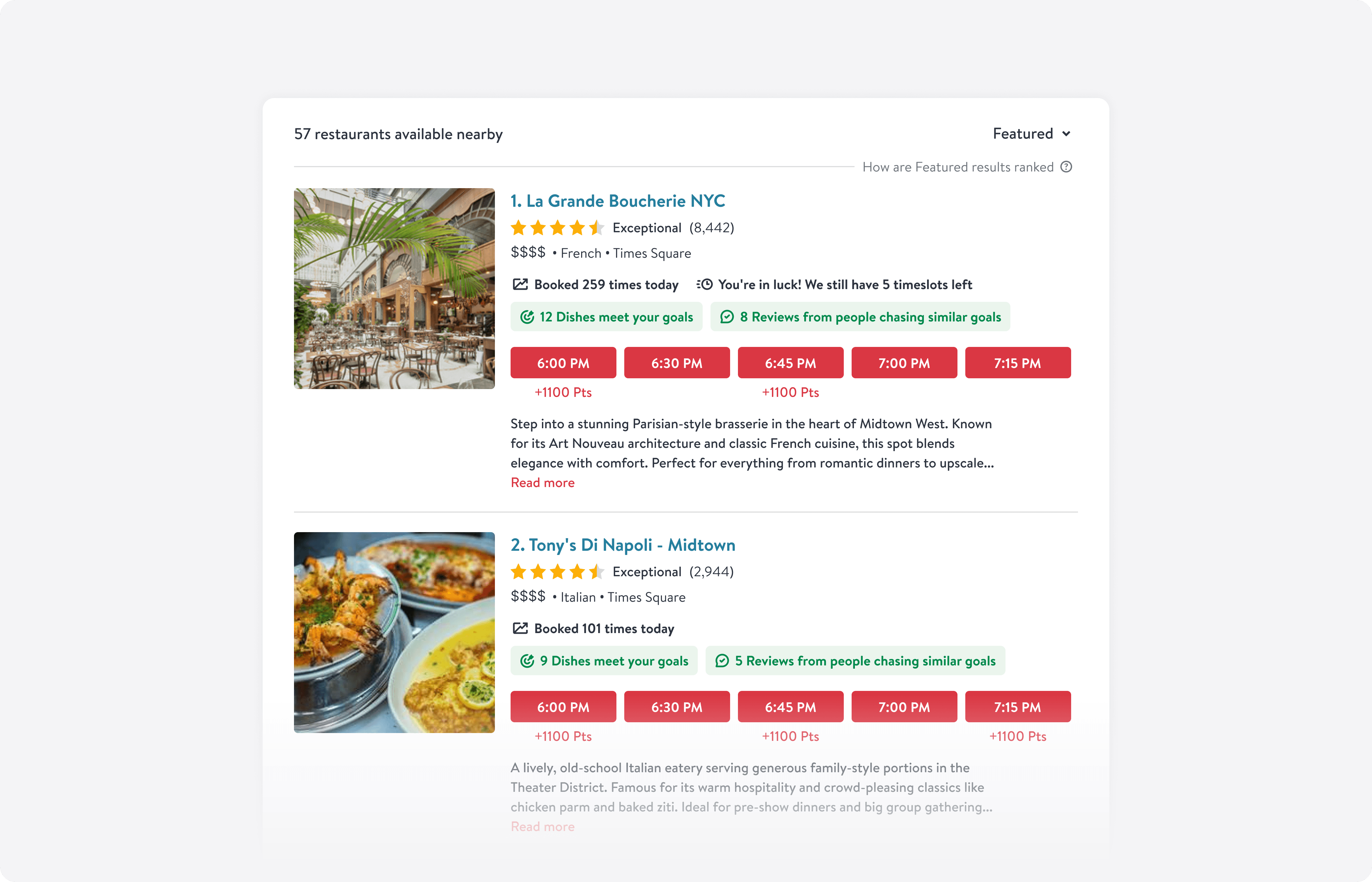 We use a custom sort operation that ranks restaurants based on how frequently they’re visited, reviewed, or engaged with by diner with similar goals. The more traction a restaurant gets within that segment, the higher it appears, giving users a quick look at what’s popular and relevant right now.