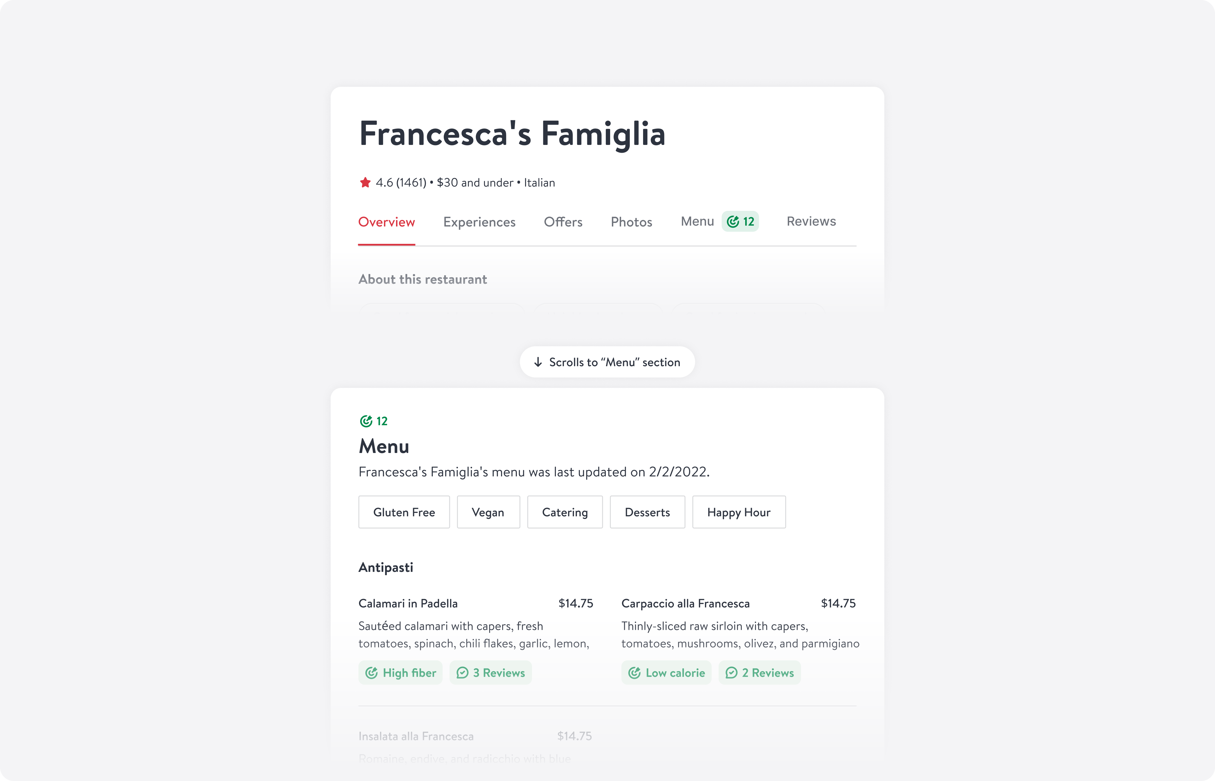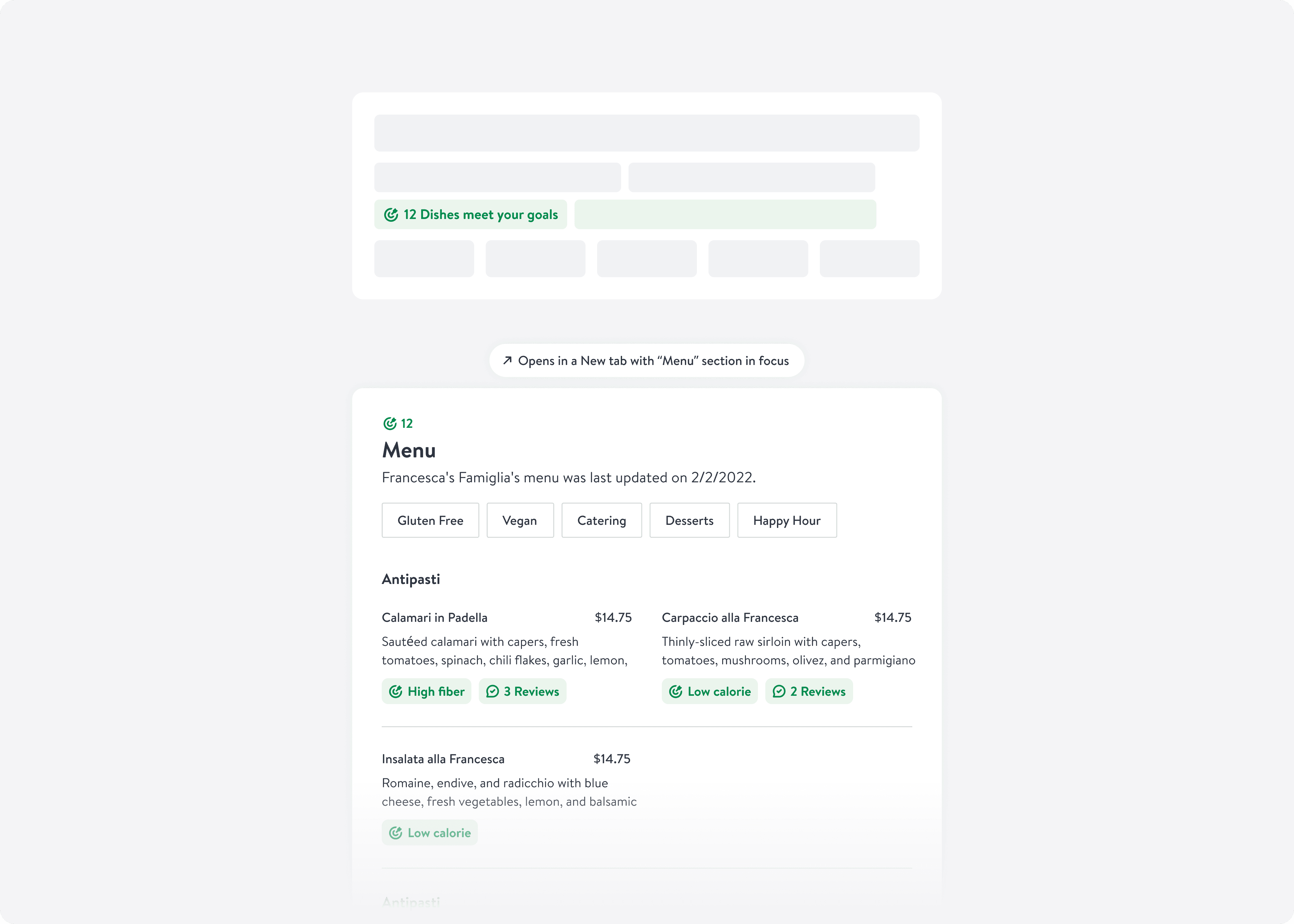 This tag includes an icon and a number showing how many dishes at the restaurant align with the user’s nutrition goals. Clicking on it instantly scrolls the page to the Menu section. This helps users with a clear intent skip the clutter and jump straight to relevant options.