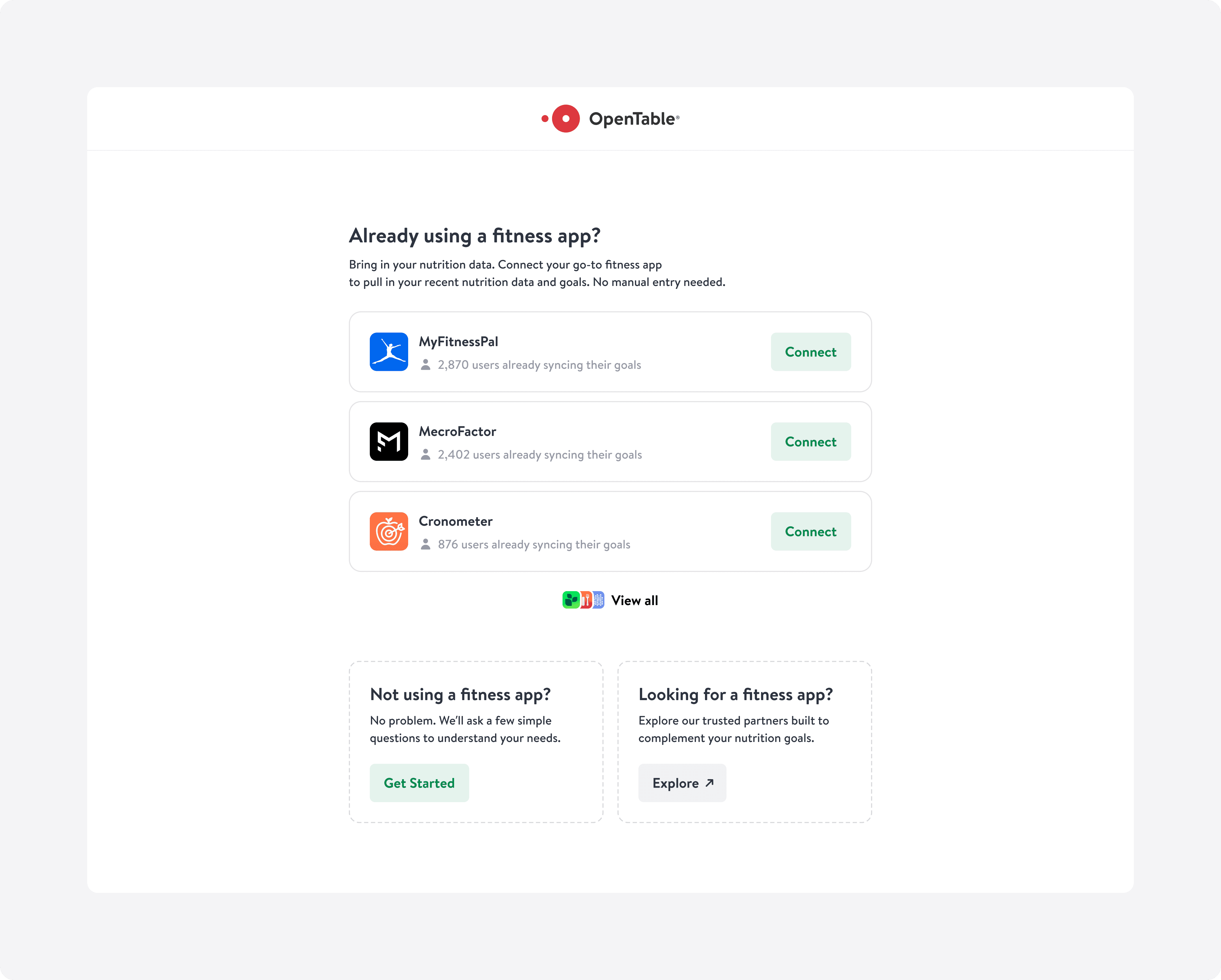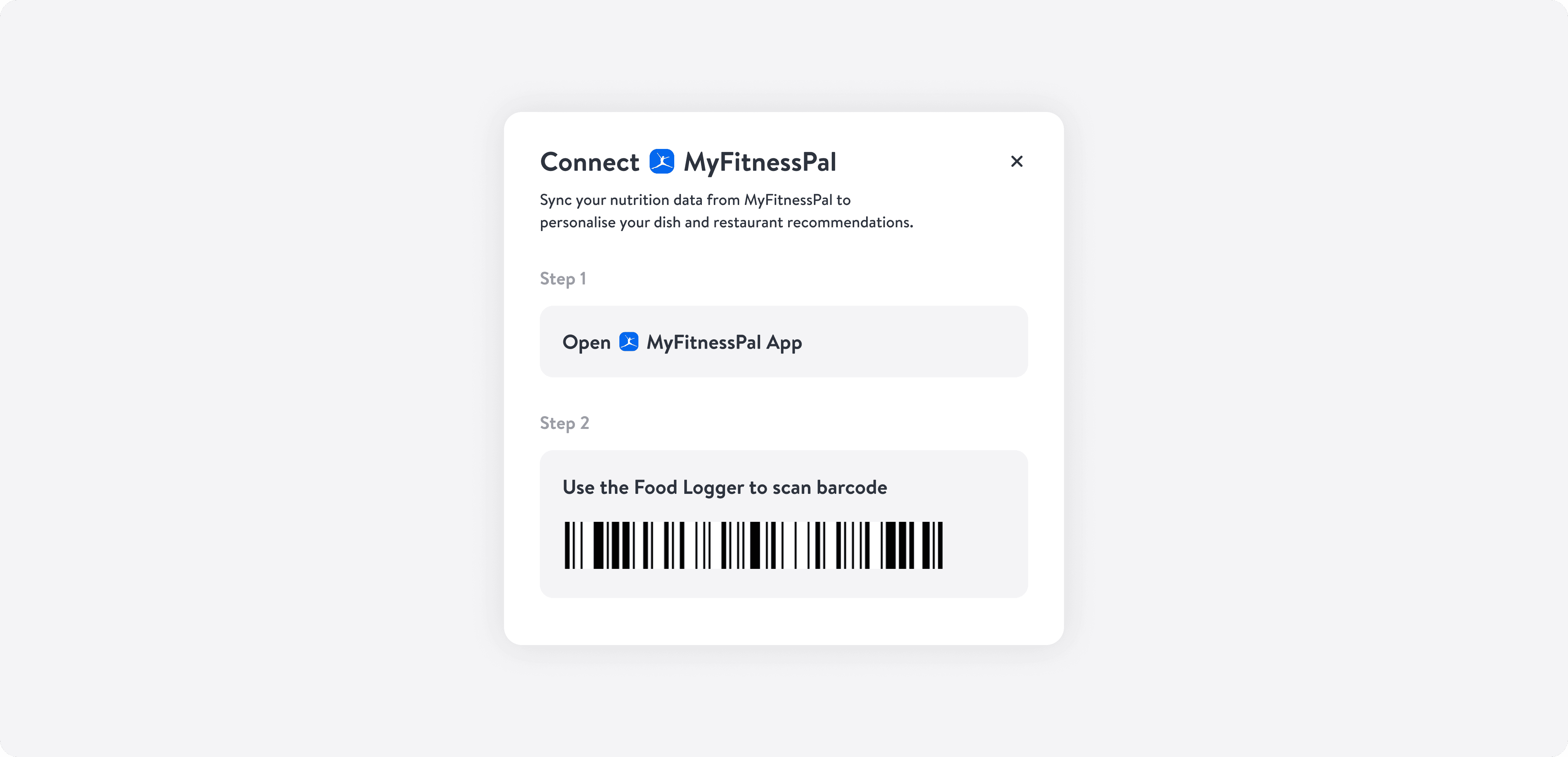 Users who already track their meals with a fitness app can get started in seconds. Once they click on the connect CTA, they’ll see a simple modal with two quick steps: