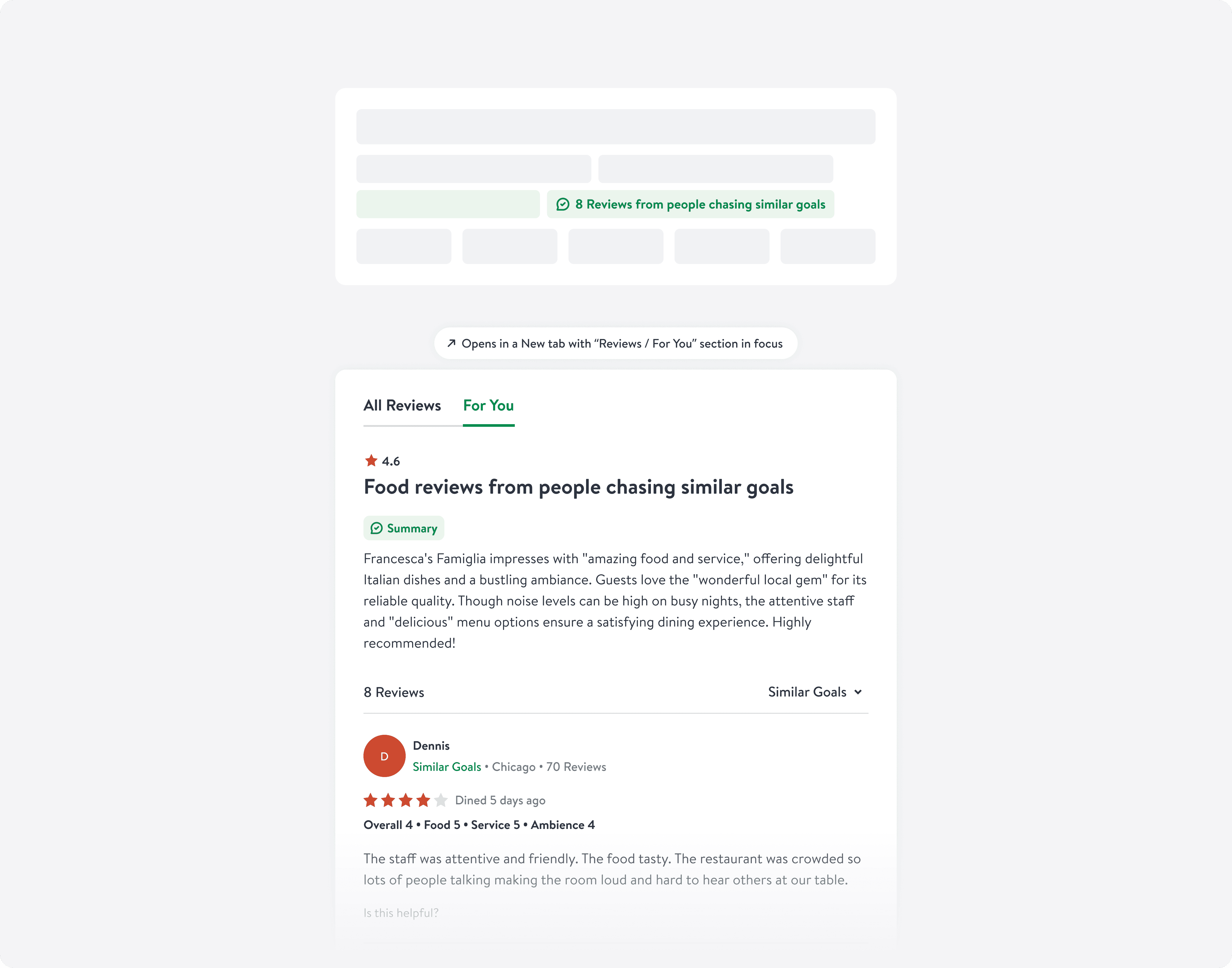 If users click on the second insight “8 reviews from people chasing similar goals”, we follow the same, this time jumping straight to the reviews section. There, users can explore a curated summary of reviews from others with similar dietary goals, along with a subtle tag next to each reviewer’s name to indicate goal alignment.