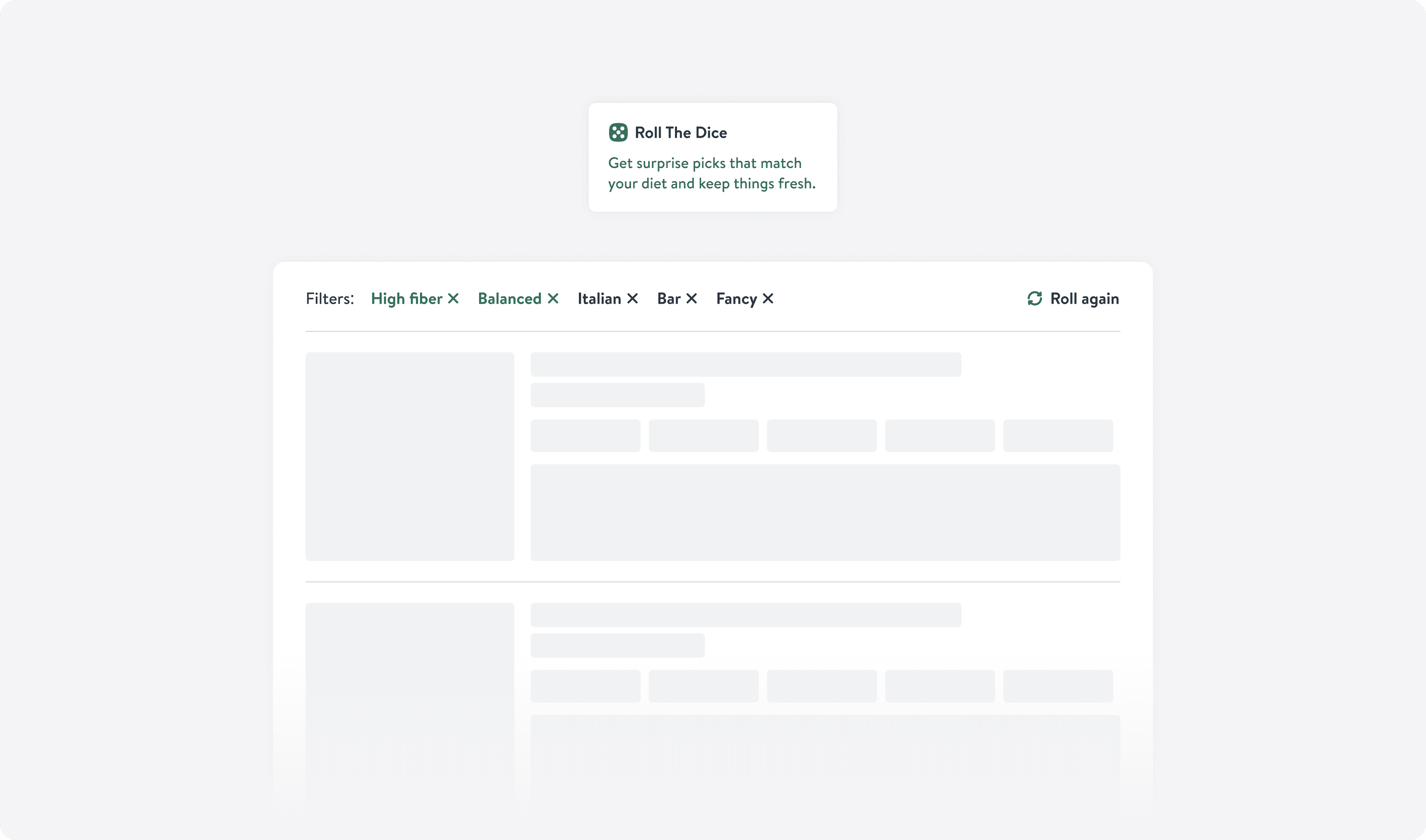 Roll the dice is a fun way to keep recommendations fresh while staying aligned with the user’s nutrition goals.