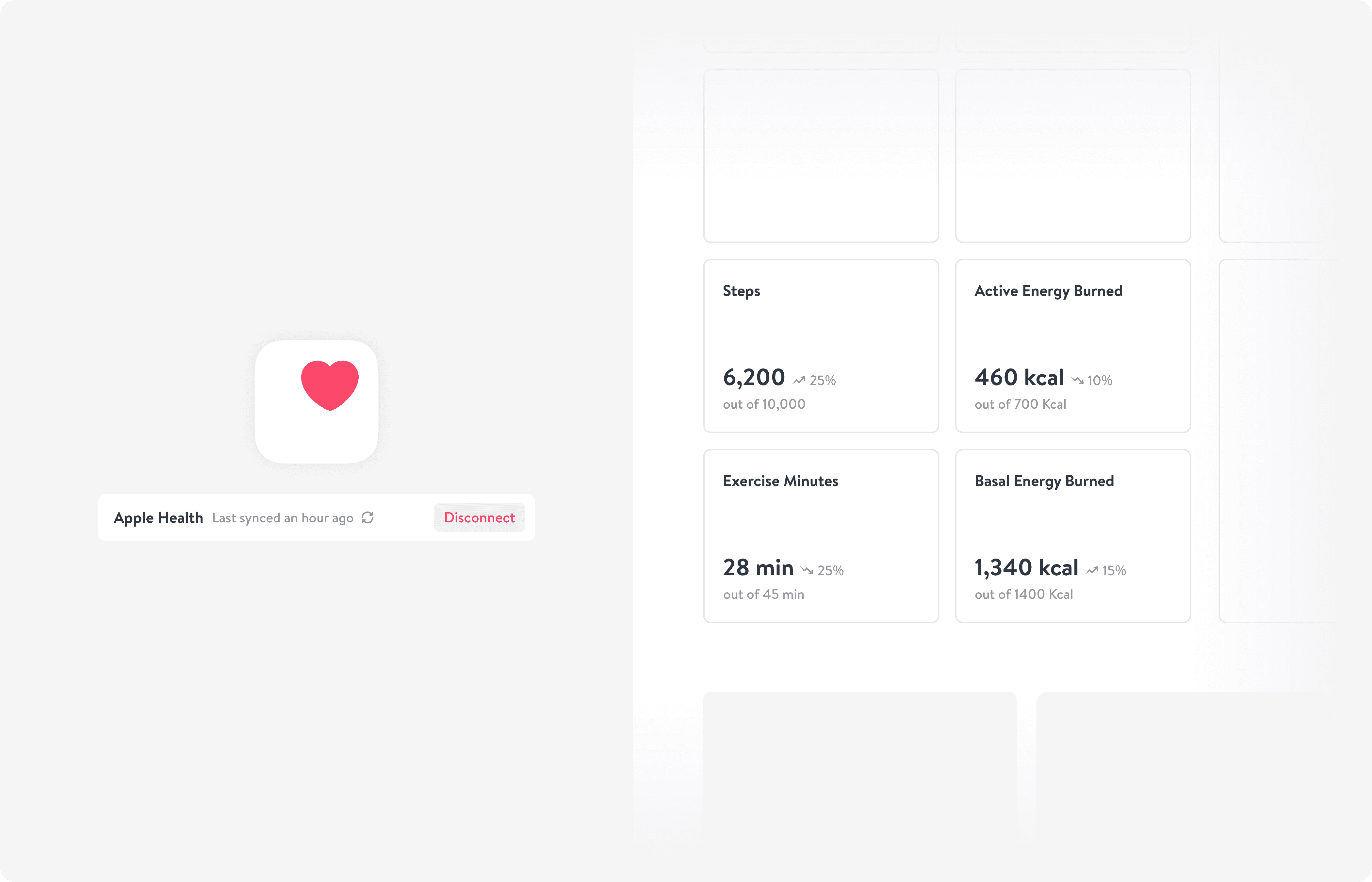 While the current view showcases key metrics like calorie intake and nutrient trends, I kept it scalable. As users connect new tools or as we support more integrations like Apple Health, the dashboard can dynamically expand to include new data points such as step count, energy burned, and exercise minutes.