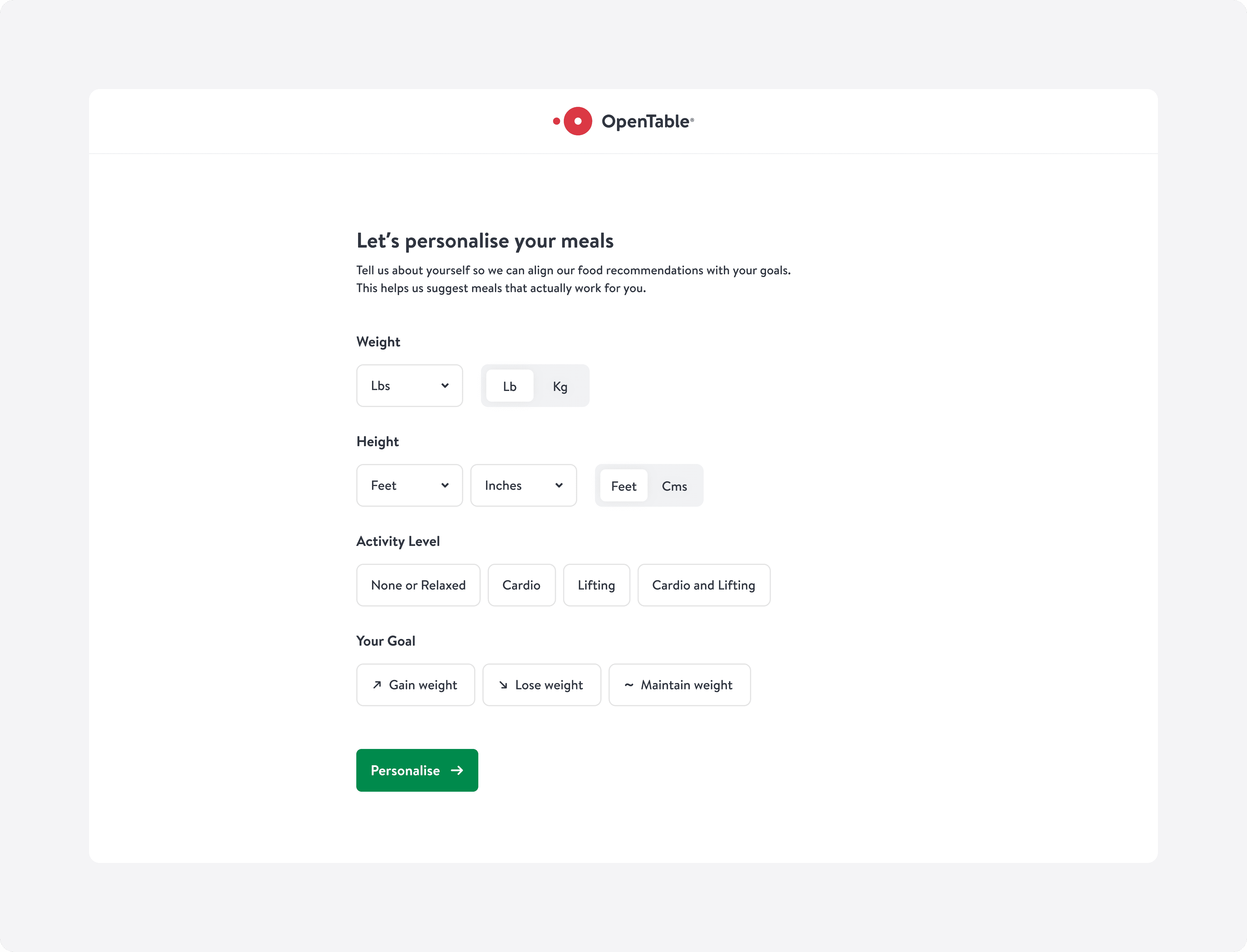 When users tap Get Started, we open a short questionnaire to understand their nutrition needs and gather just enough data to start offering meaningful recommendations.