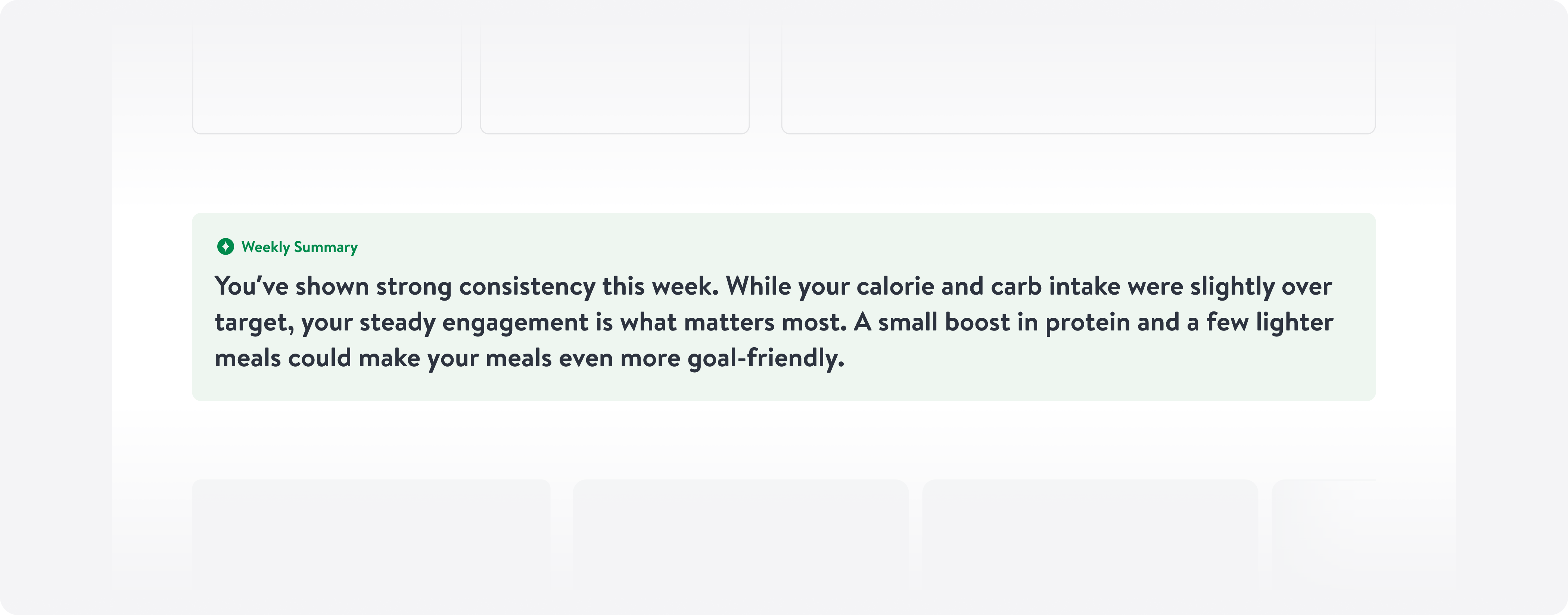 This section provides a short AI-generated summary of the user’s eating habits over the past week. The summary is written with positive reinforcement in mind: acknowledging progress while suggesting simple areas for improvement.