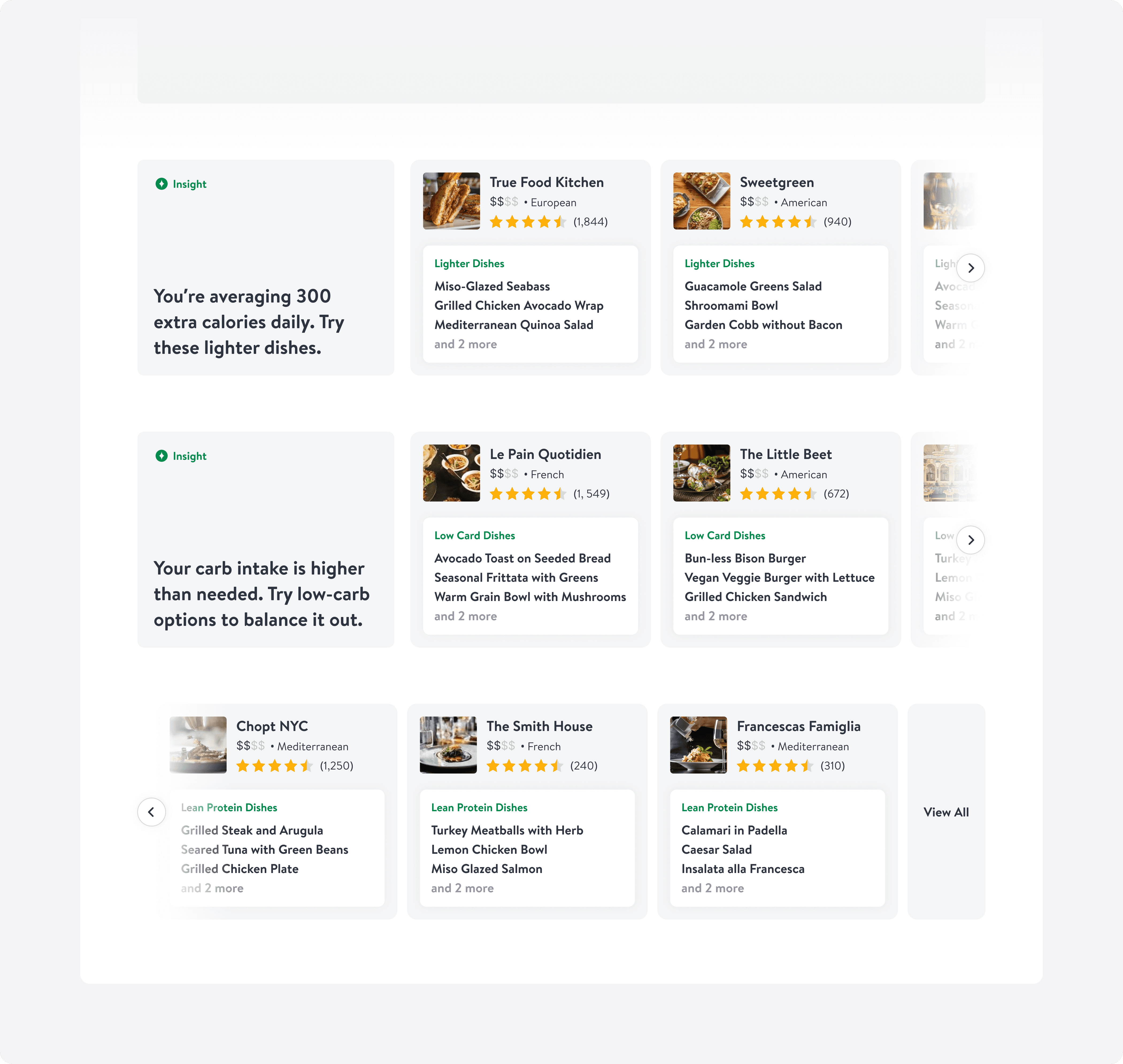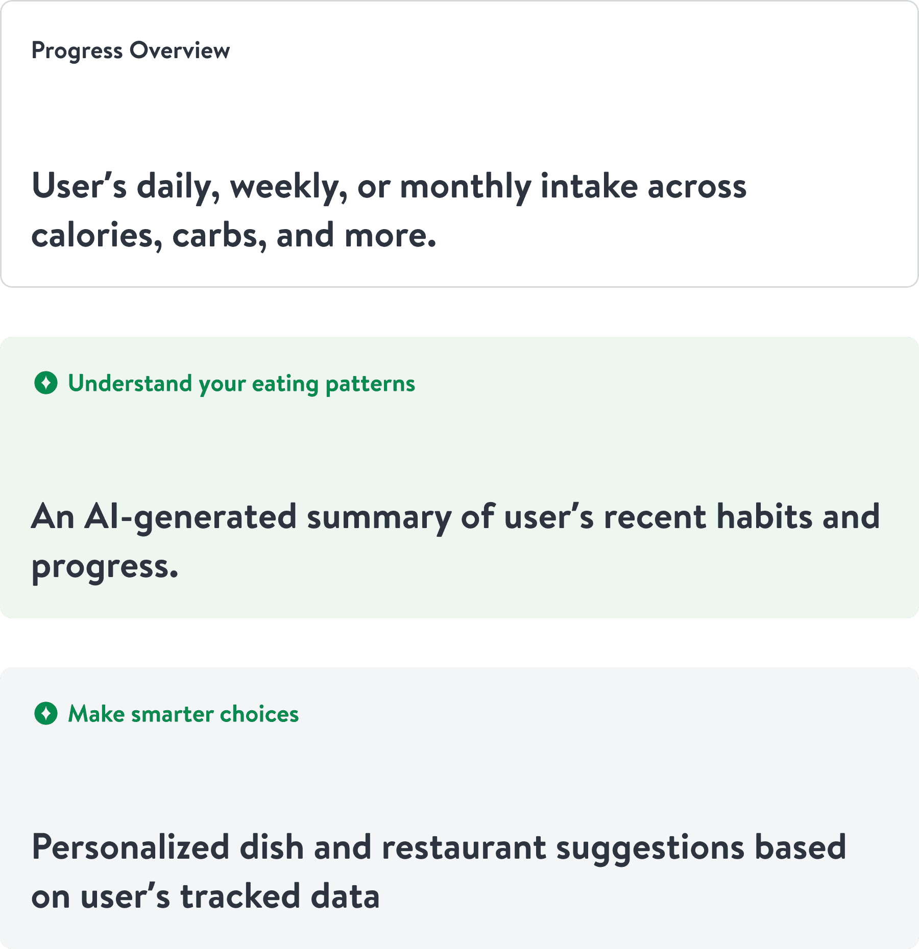 For example, if a user is consistently over their calorie target, we suggest lighter dishes from restaurants that align with their dietary needs.