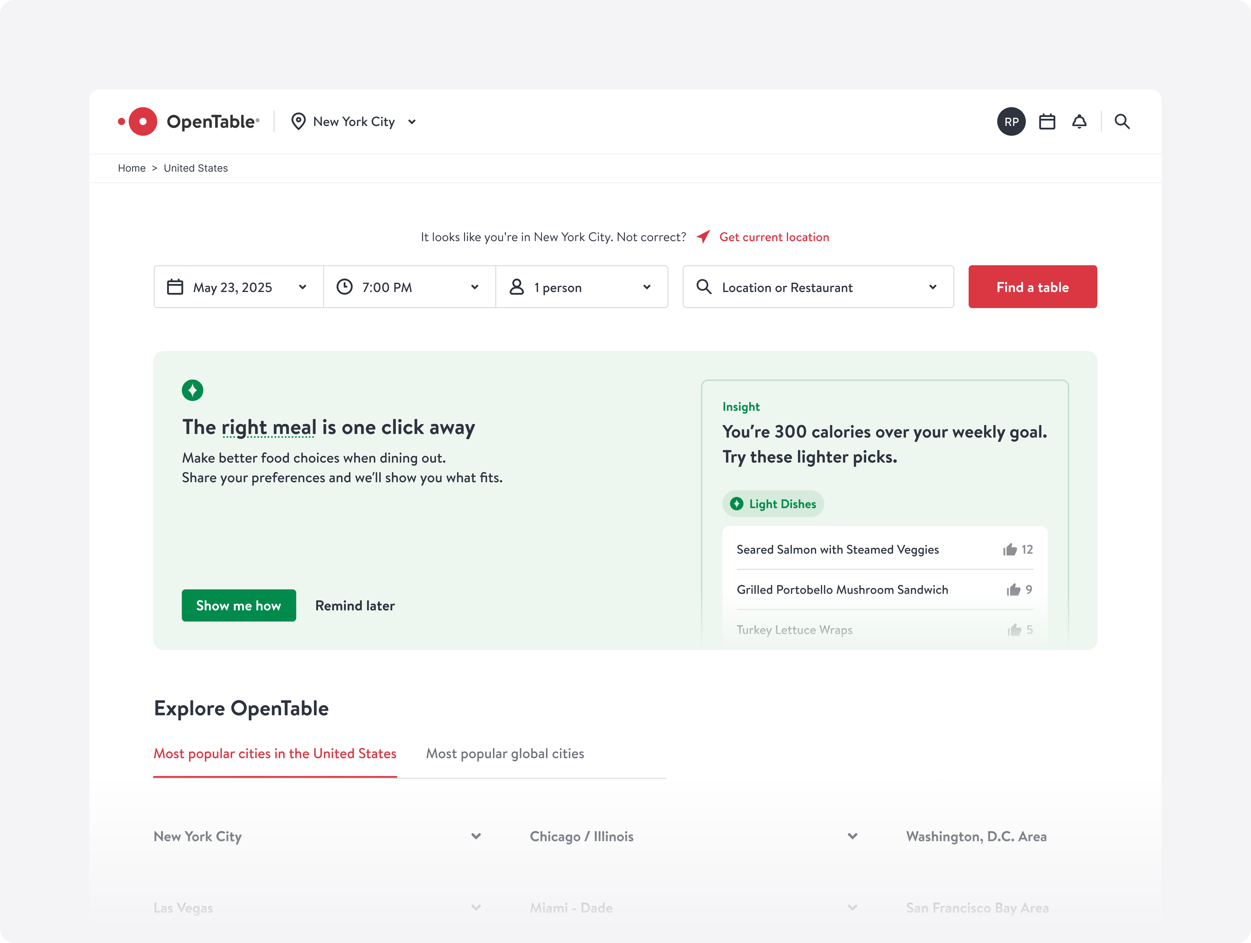 Instead, I chose a more meaningful reference point: users pursuing similar goals (a niche yet important user group). By surfacing data based on shared nutrition patterns and outcomes, OpenTable can highlight what’s working for people just like you. It’s about what’s both popular and right for the user.
