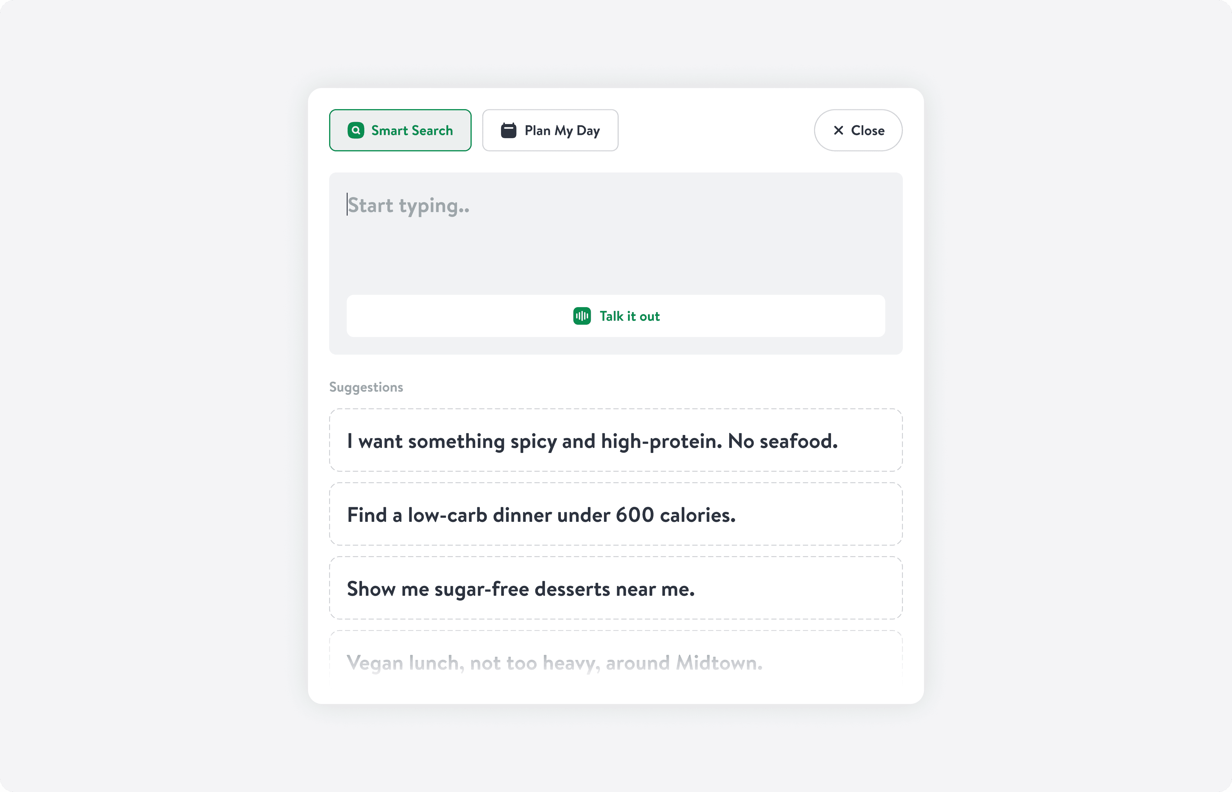 To make food discovery more intuitive, I designed Smart Search as a natural, open-ended interface. When users click the Smart Search option, a modal opens with a prompt to start typing or use voice input.